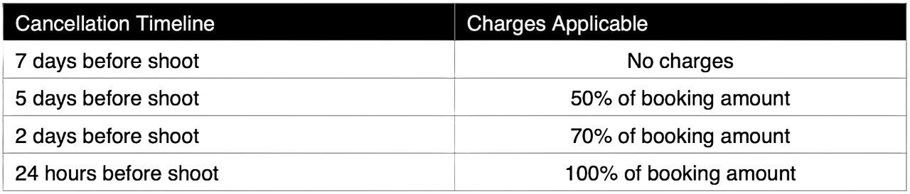• Shoot bookings are confirmed only after receipt of 50% advance payment.