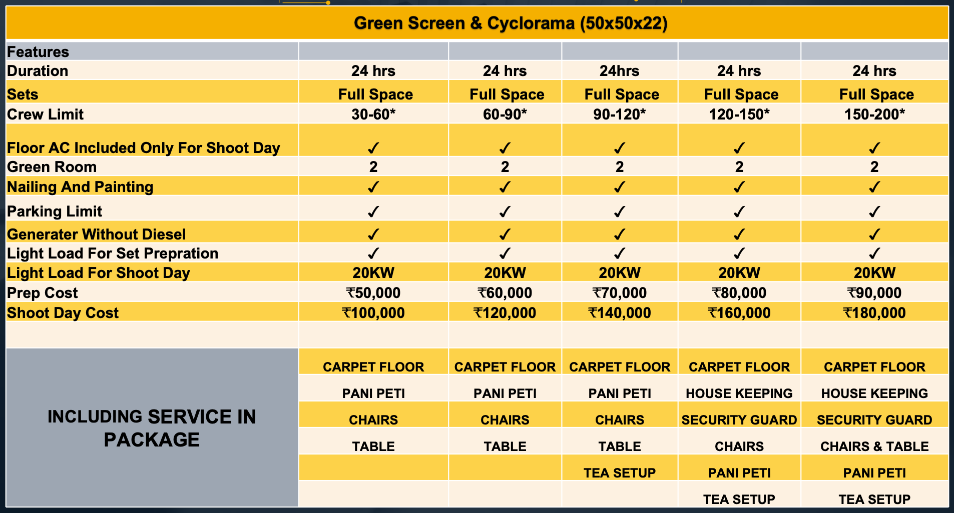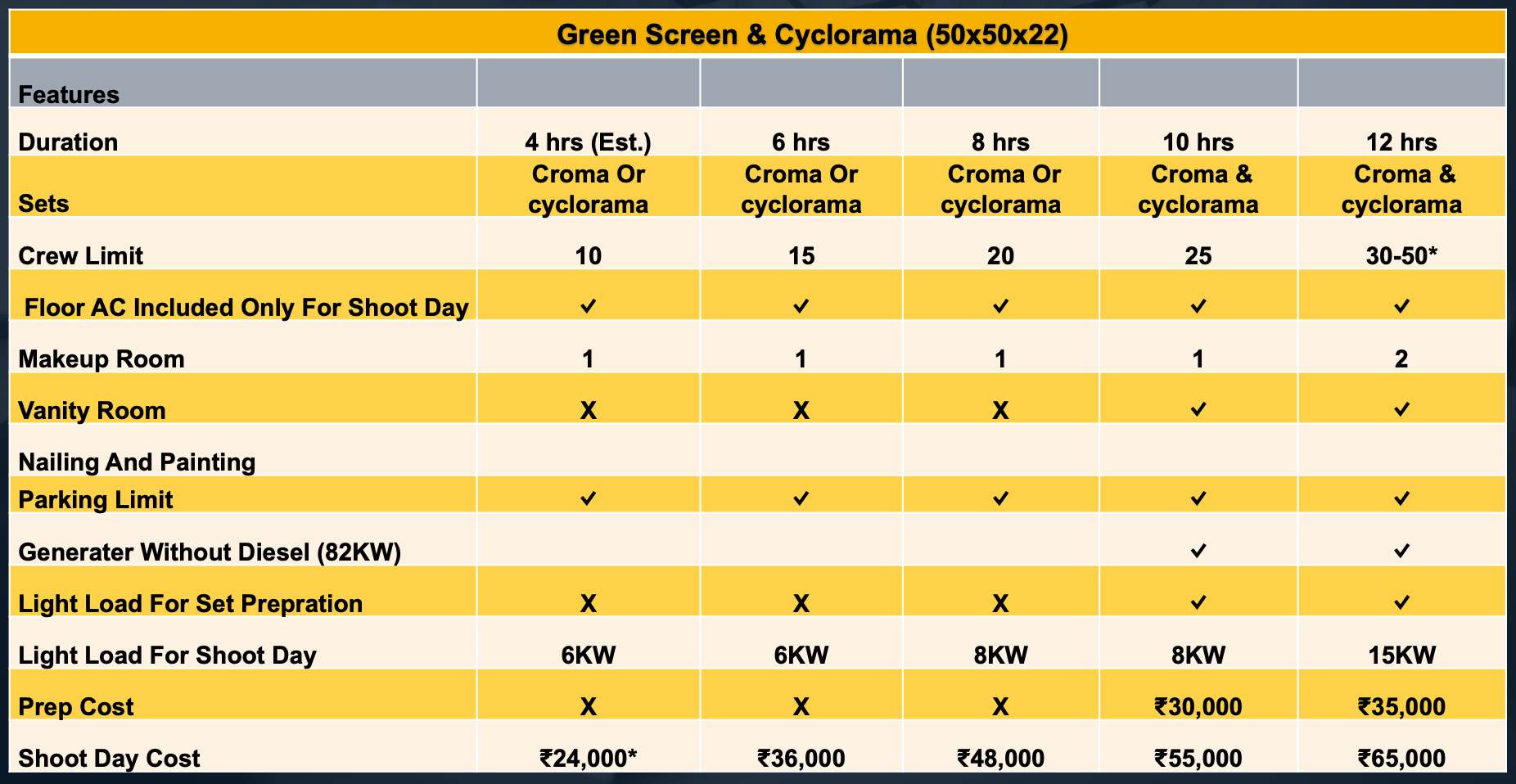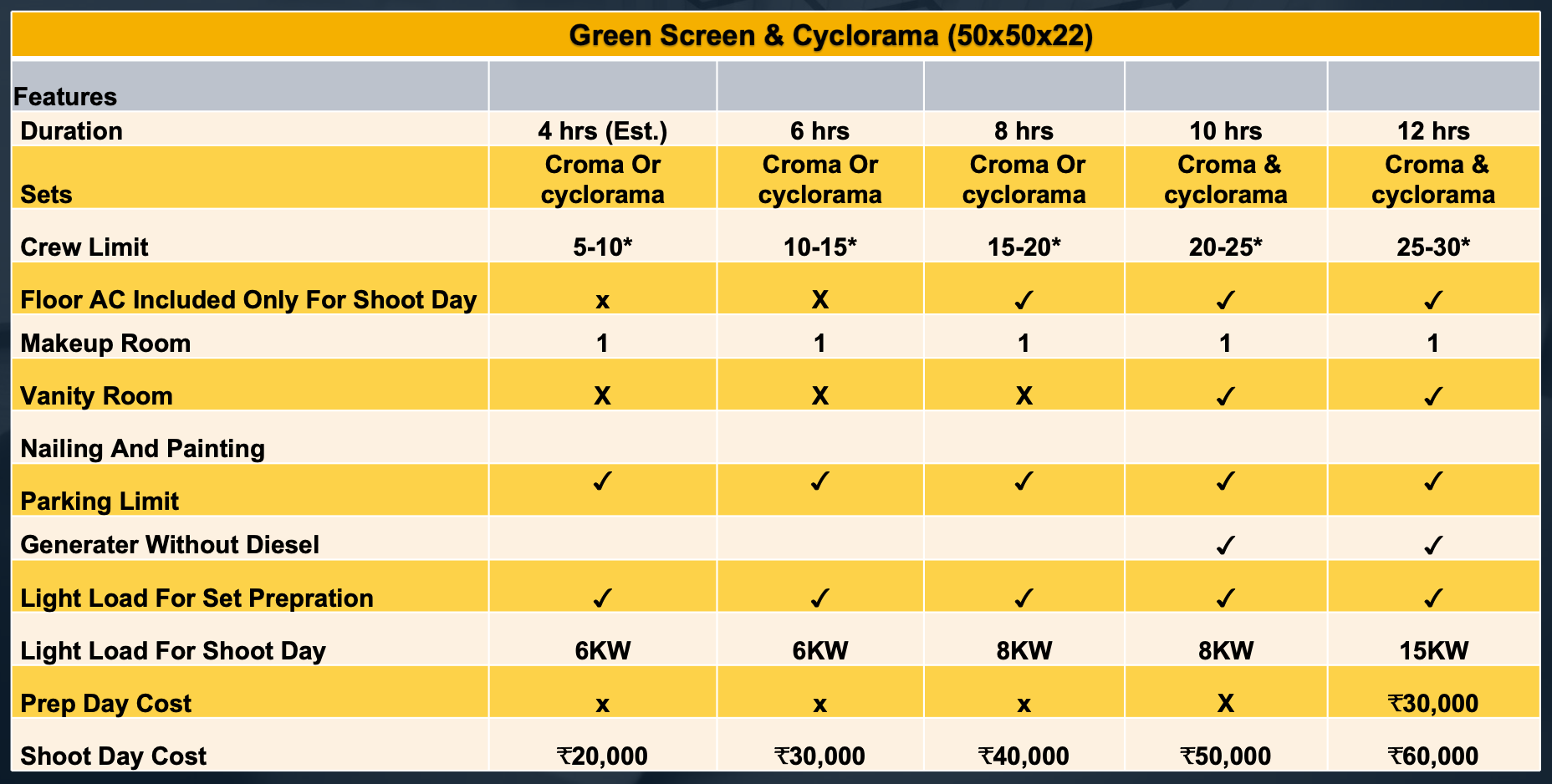 Our studio features a green screen (chroma) setup, ideal for shoots that need background replacement. It lets you film with a plain backdrop that can be digitally swapped with any setting in post-production—perfect for adding creative flexibility to your content.